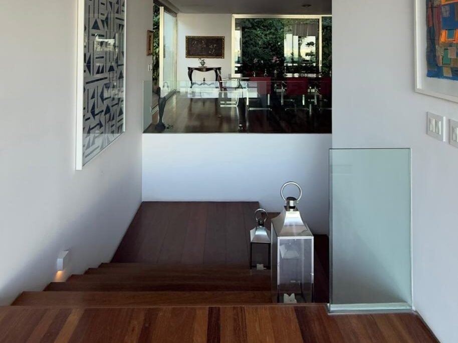 Um hall generoso, marcado por escadas em madeira e atravessado pela transparência de um elevador panorâmico, estabelece o tom: tudo foi pensado para fluir, nunca para impressionar à força.
