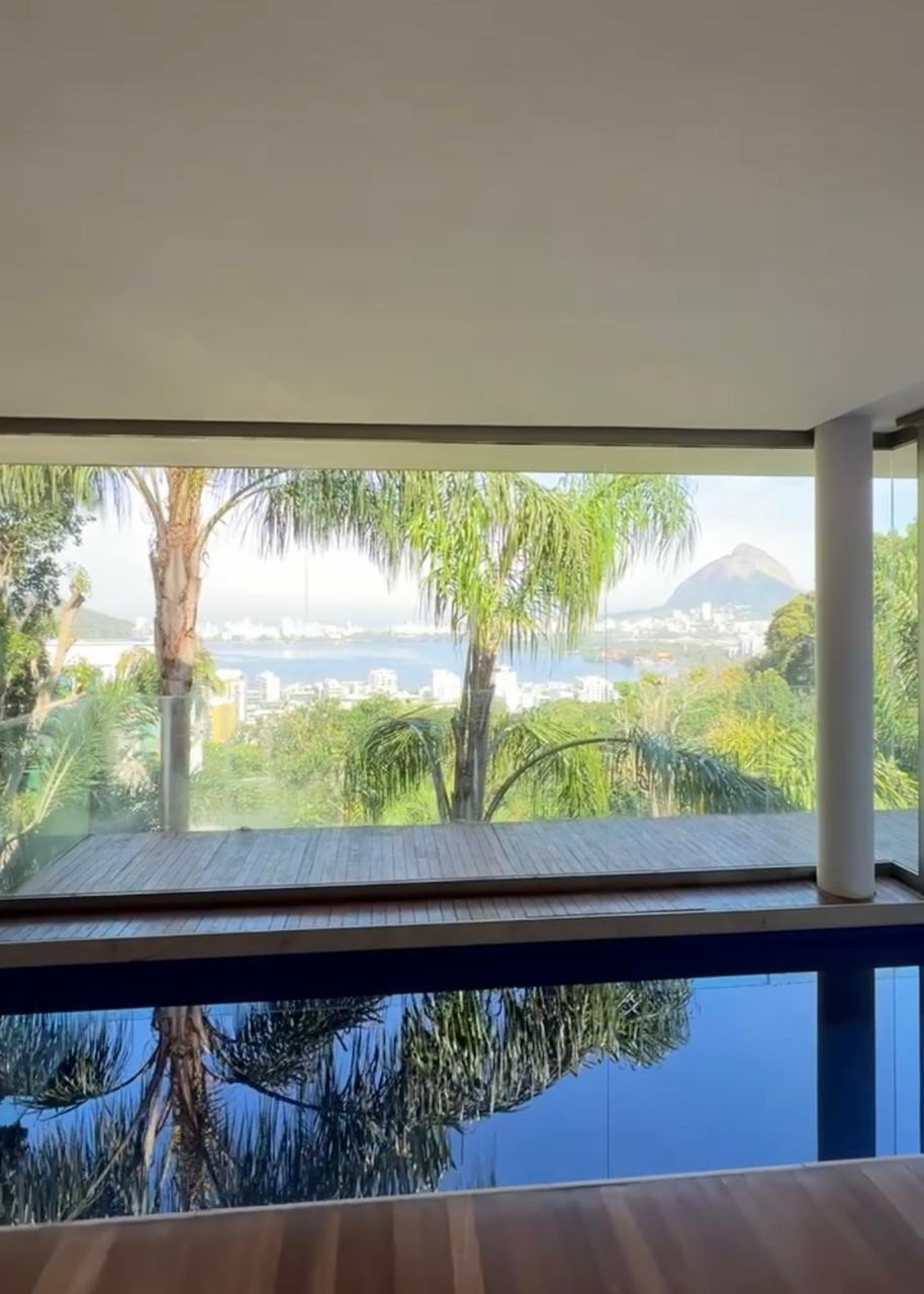 No mesmo pavimento, uma piscina de raia, parcialmente interna, convida a relaxar em total integração com a casa e a natureza.