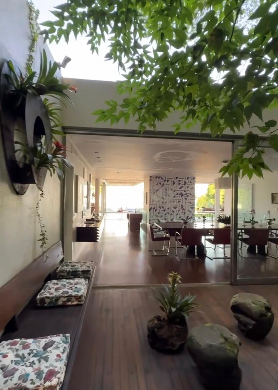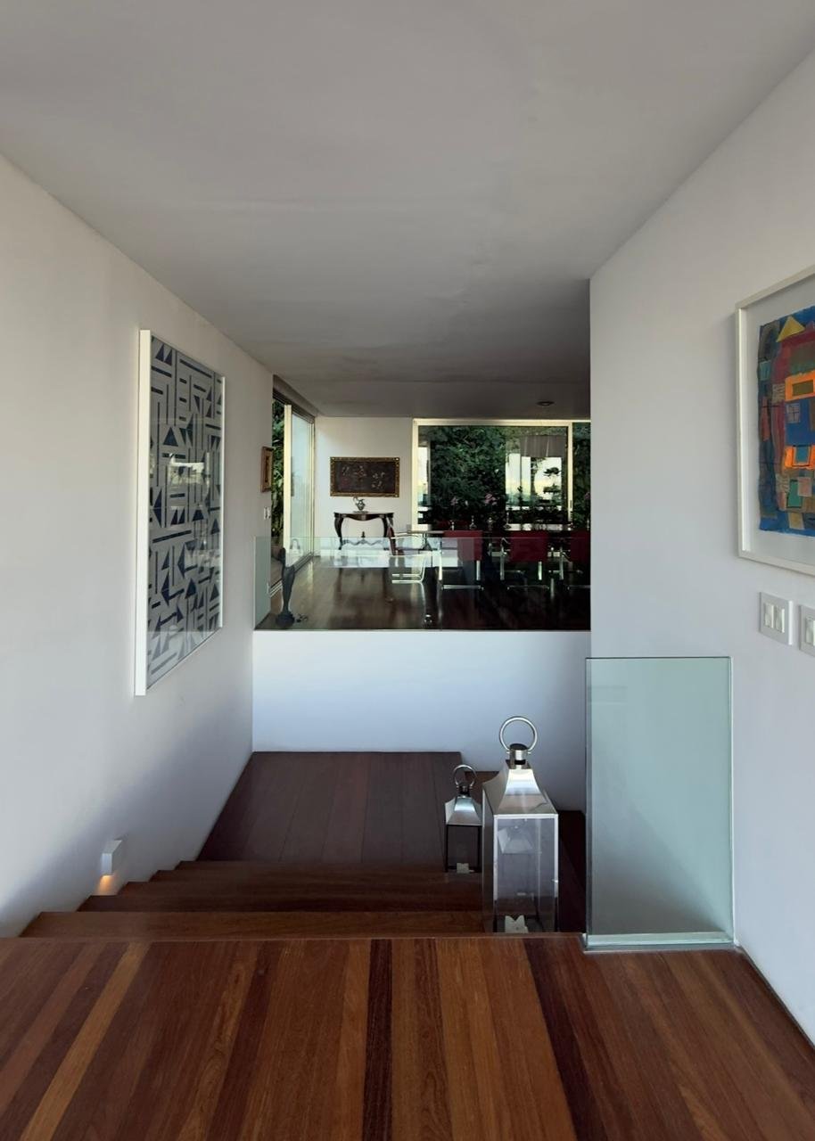 Logo na entrada, um hall imponente emoldurado por escadas em madeira e um elevador panorâmico conduzem ao restante da casa.