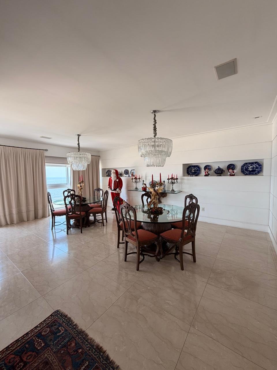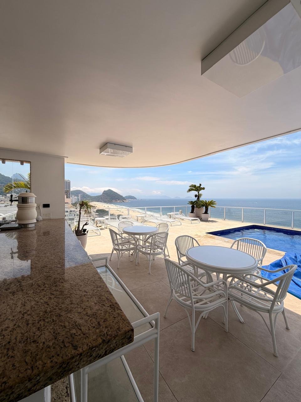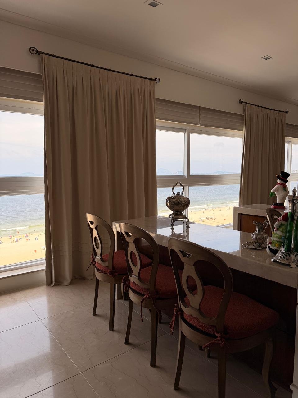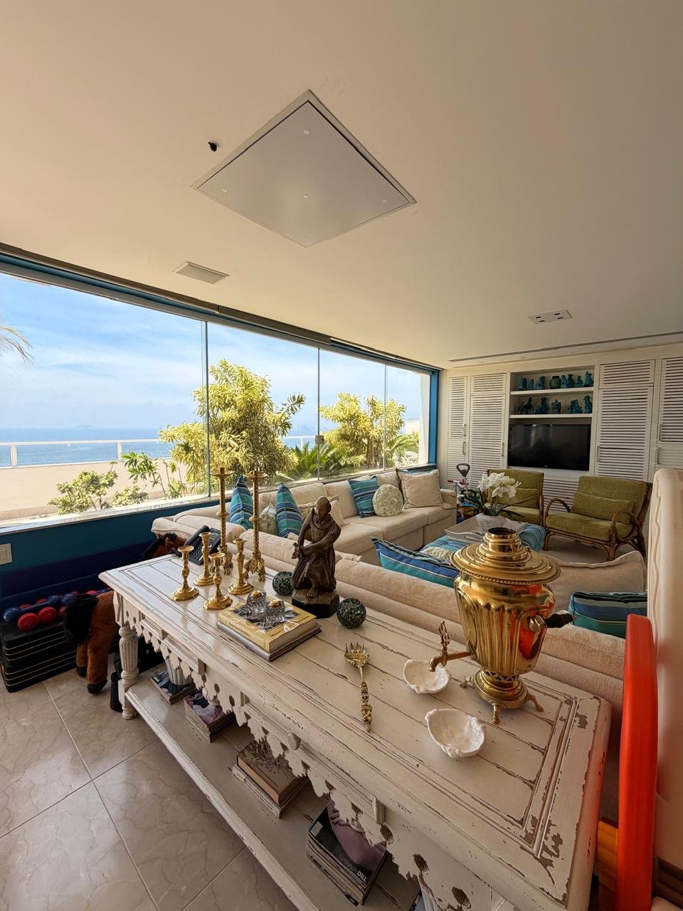 A sala se desdobra em quatro ambientes — estar, jantar principal, living complementar e bar — todos posicionados para aproveitar a amplitude do andar e a linha contínua de janelas que revelam a praia de Copacabana em toda sua extensão.