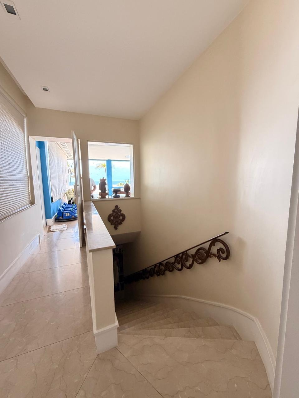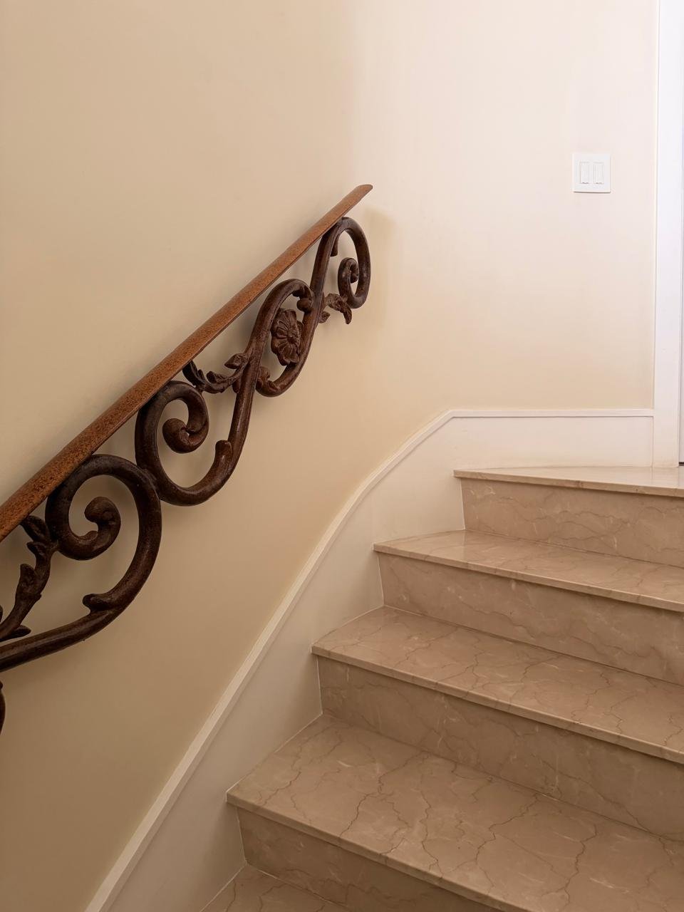 A escada em mármore, com corrimão artístico em ferro trabalhado, conduz ao segundo pavimento — um andar inteiro dedicado ao conforto e às experiências cotidianas da família.
